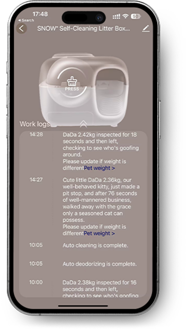 使用後はセルフクリーニング。砂の交換が必要な場合は、携帯電話をワンクリックするだけで、PetSnowy あなたに代わって処理を行います。